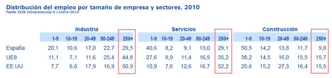 De sobra es conocido que el tejido empresarial en España lo conforman en su mayoría pymes y micropymes. Esto en esencia no es muy diferente del resto de países de nuestro entorno, de hecho estamos en la media de la UE (28) según la Dirección General de Industria y de la PYME en cuanto a distribución de empleados por tamaños de empresa. Pero si escarbamos un poco más en los datos y revisamos que pasa con los más avanzados de nuestro entorno, esos a los que nos gustaría parecernos, encontramos sensibles diferencias en cuanto al número de empleados en grandes empresas: