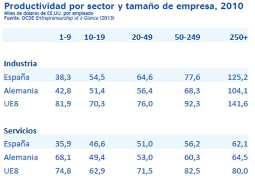 Cruzando datos de ambas tablas obtenemos uno de los factores que lastran la productividad en España y explican en parte, porqué siempre se pone en entredicho nuestra productividad como país. Pues las empresas grandes alcanzan niveles de productividad más elevados debido principalmente a economías de escala, más capital humano y menor temporalidad, más I+D+i, mayor internacionalización y exportación y mejores condiciones de financiación.