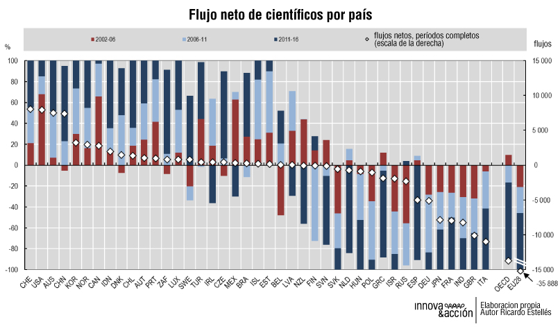 En este otro, se analizan los flujos positivos (se importan científicos al país, barras por encima de cero) y los negativos (salen científicos del país, barras por debajo de cero). En el caso de España, se muestra un cambio de tendencia clarísimo. En los períodos 2002-2006 y 2006-2011 nuestro país atraía talento científico, poco pero positivo, mientras que la tendencia se revierte claramente en el período 2011-2016 con una salida neta clara de talento científico de nuestro país.
