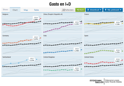 En este gráfico comparativo podemos ver la evolución por países del % de inversión en I+D sobre PIB (línea de color), comparada con la media de todos los países OECD (línea negra)