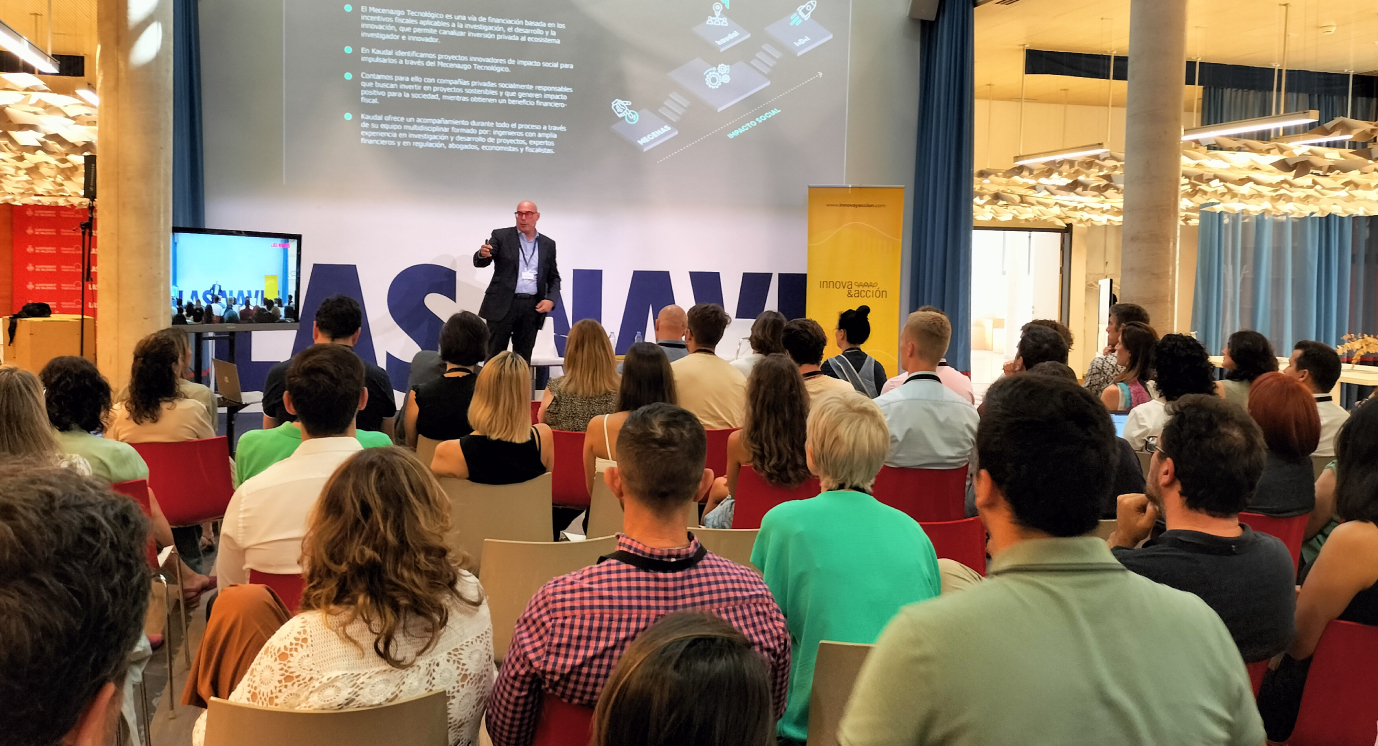 Habló de Kaudal, la empresa en la que trabaja y que es intermediaria entre empresas mecenas de distintos ámbitos y proyectos innovadores de impacto social. Desde 2016 son más de 250 proyectos los que se han beneficiado del Mecenazgo Tecnológico, más de 95 en el año 2021.