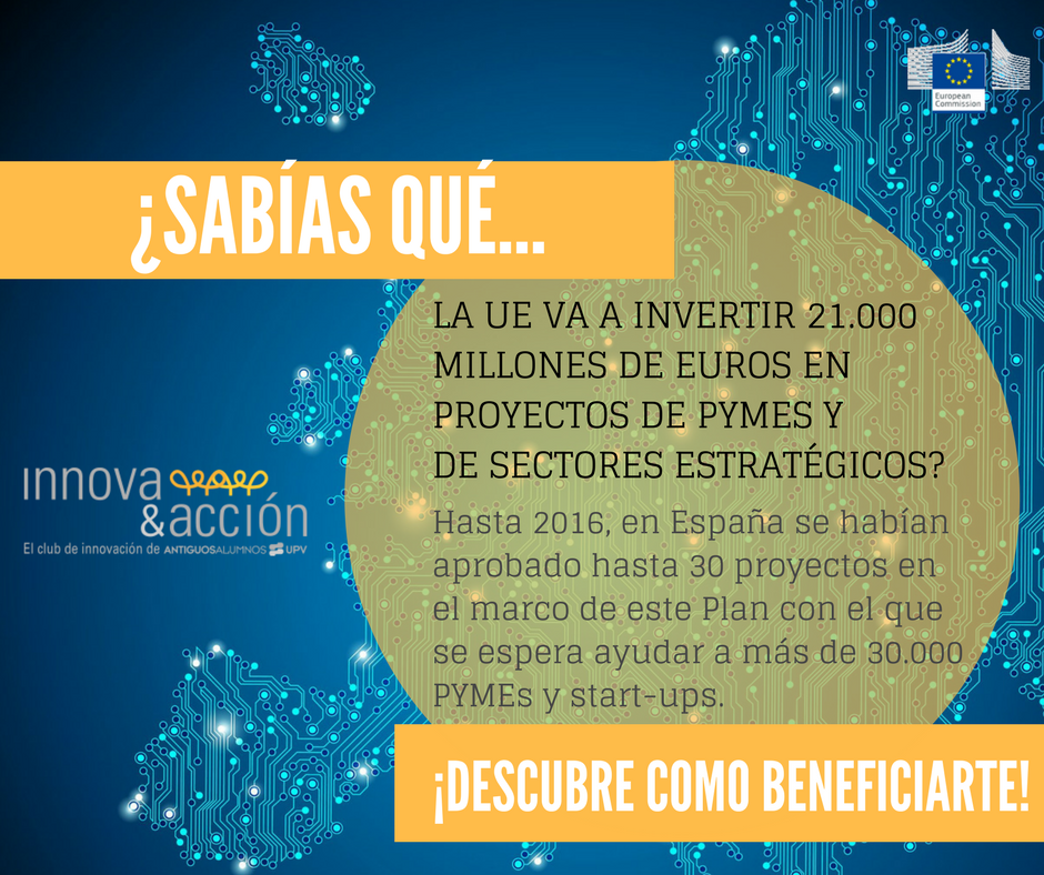 ¿Sabías queé la UE va a invertir 21.0000 millones de euros en proyectos de PYMES y de sectores estratégicos? Hasta el 2016, en España se habían aprobado hasta 30 proyectos en el marco de este Plan con el que se espera ayudar a más de 30.000 PYMES y start-ups.